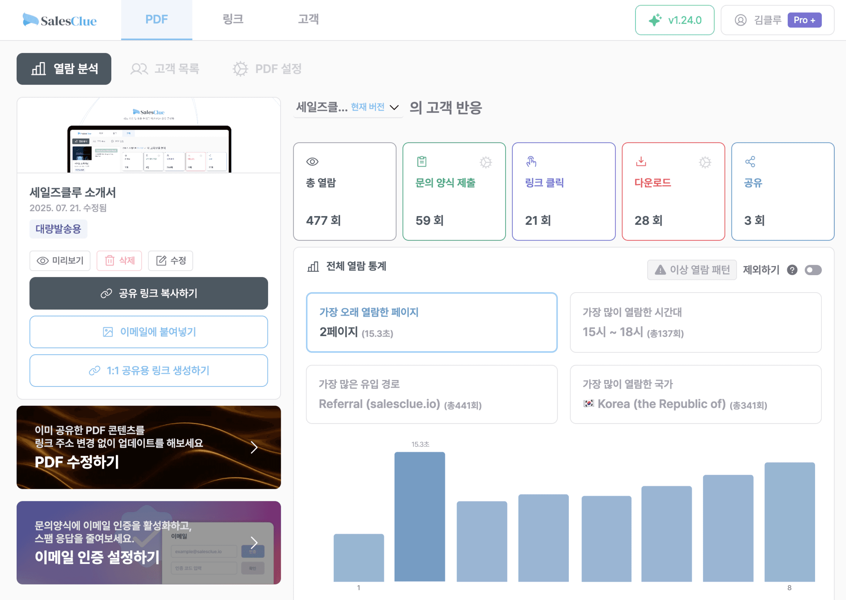 세일즈클루는 PDF 공유로 끝나지 않게, 열람 데이터를 미팅/전환으로 연결합니다.