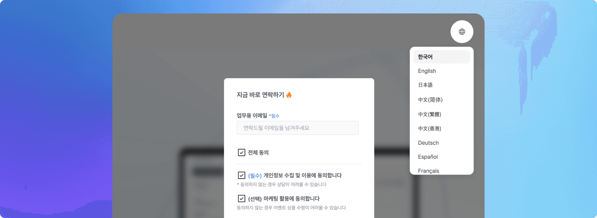 변경되는 것은 뷰어 인터페이스 언어(UI)이며, 문의양식 내용은 변경되지 않습니다. 다만, 문의양식의 ‘필수/선택’ 표기 등 시스템 UI 요소는 선택한 언어에 맞게 변경됩니다.